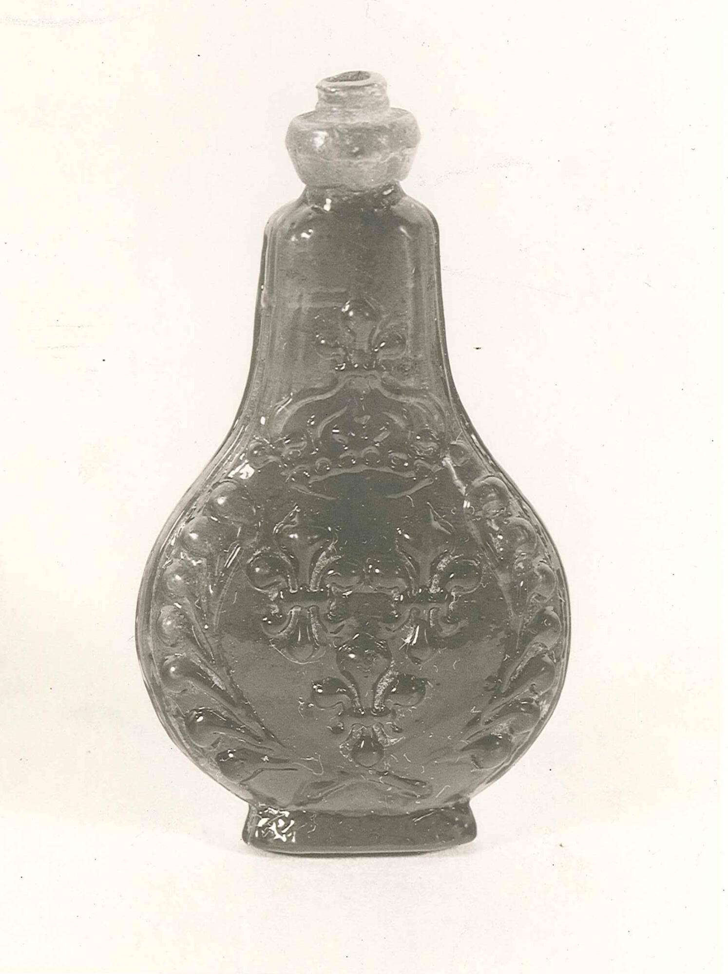DescriptionDark blue glass, mold blown, pewter cap. Obverse: fleur-de-lys surmounted by a crown; Reverse: hearts surmounted by a floral branch.