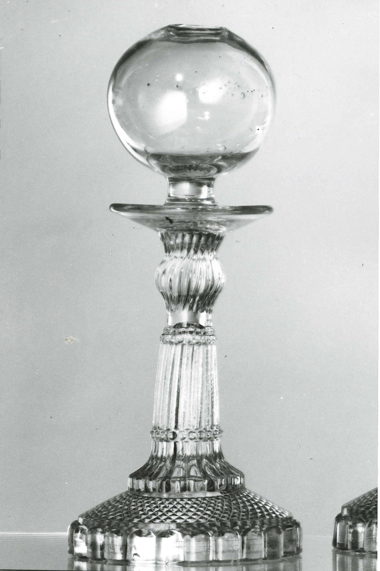 DescriptionClear glass; blown spherical font, pressed shaft and base.