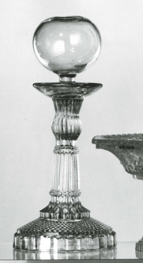 DescriptionClear glass; blown spherical font, pressed shaft and base.