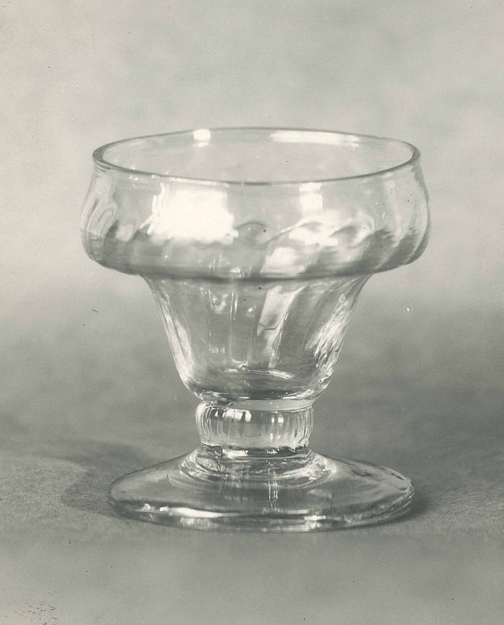 DescriptionClear white glass. Goblet shape. Delicate spiral fluting in relief. Mold blown glass.