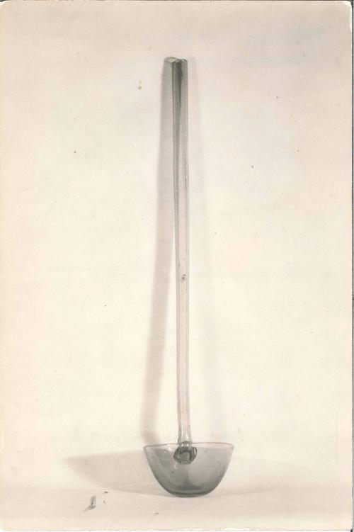 DescriptionLong handled spoon of green glass. Hollow tubular handle, globular bowl.