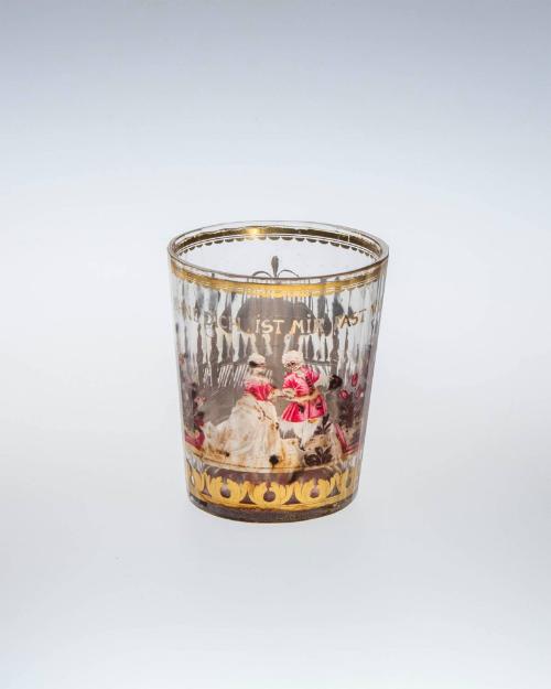 DescriptionFlashed and etched glass. Design in colors and gold. Ruby bottom.