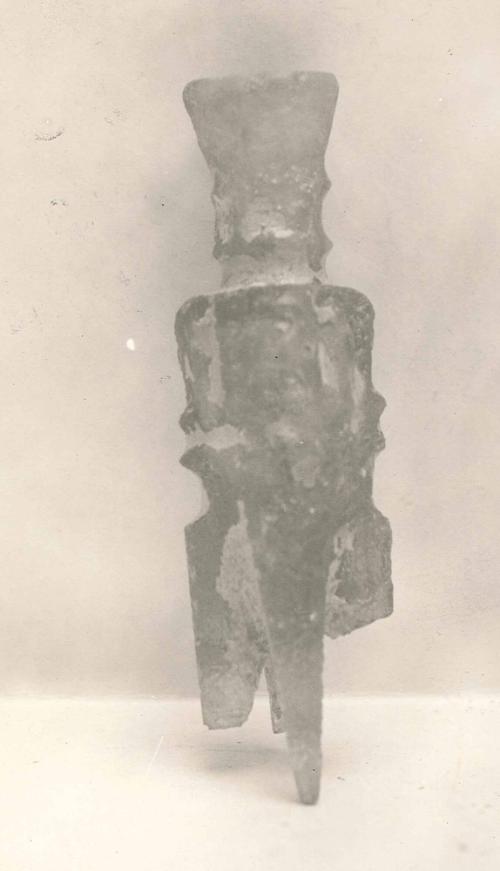 DescriptionLight green; conical neck; bottom of neck with four square motifs; rectangular body; groove around middle of body; each corner cut away above and below groove, leaving points at either end of cut; each side with two vertical cuts above groove; bottom cut to form four long, pointed feet. The resemblance of this type of flask to human teeth has resulted in them being called "molar flasks."