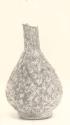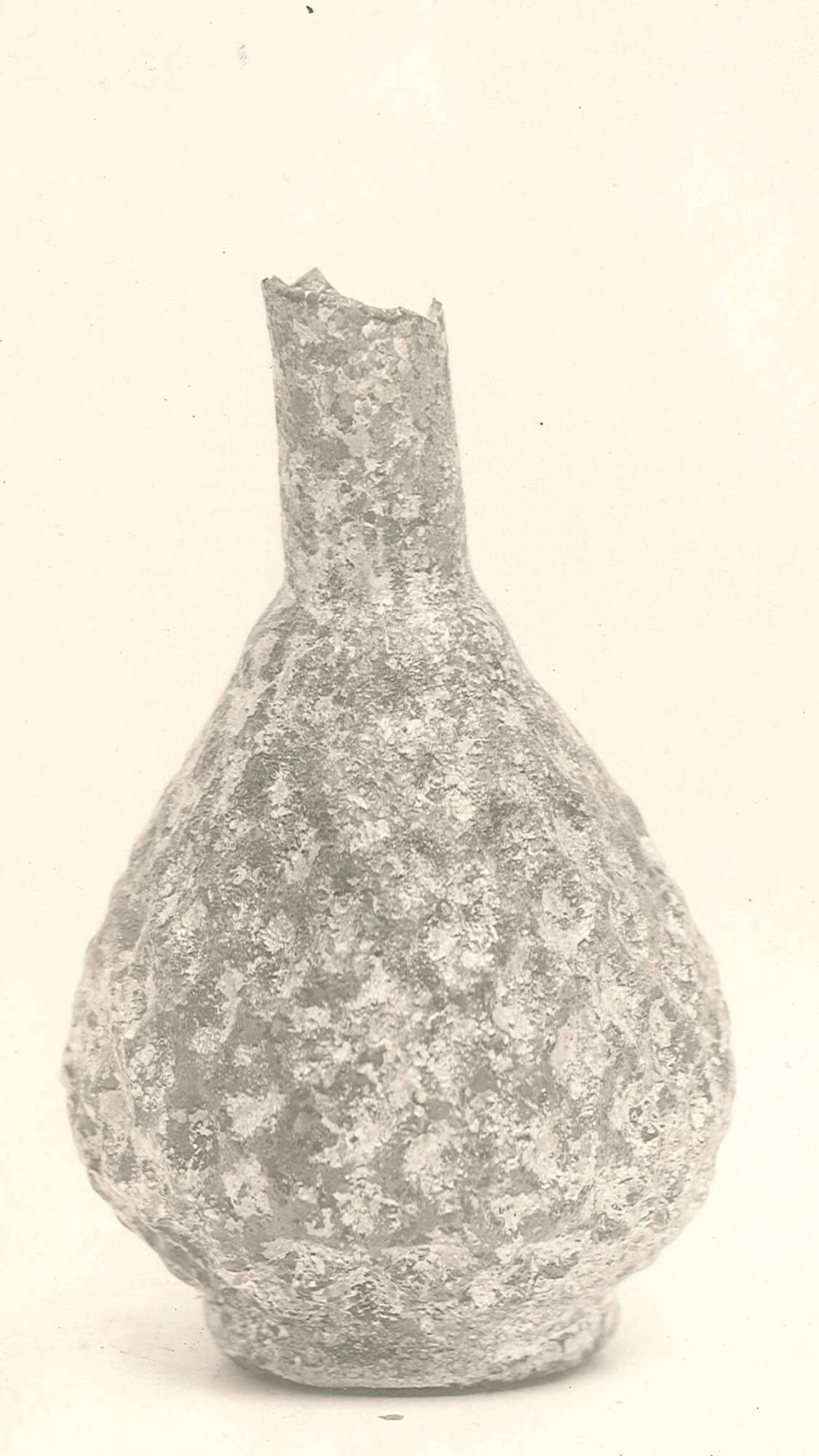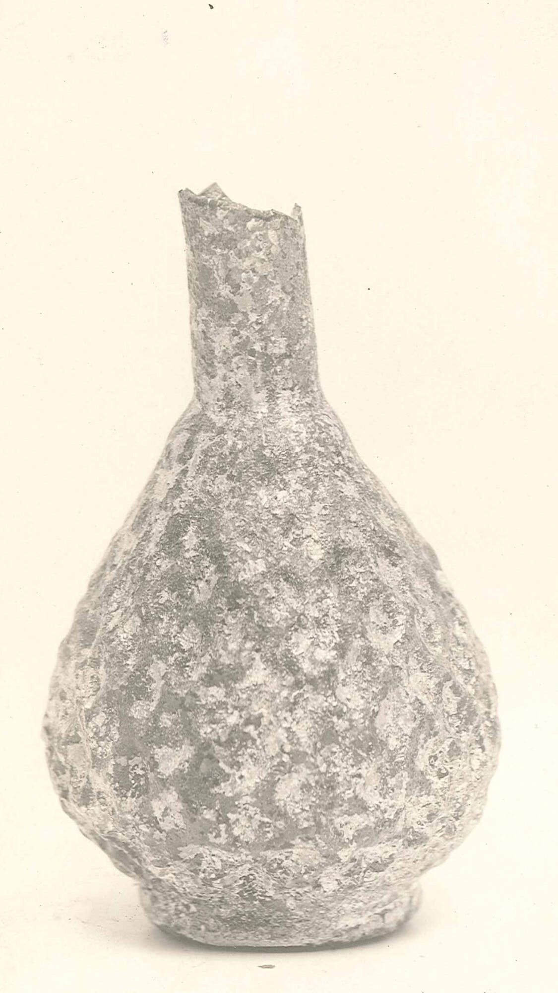 DescriptionOvoid body on flat base with narrow cylindrical neck. Translucent dark manganese purple glass. Iridescent and roughened by disintegration. Decoration all over body of intersecting diagonal lines, leaving small depressed diamond-shaped spaces between. On bottom, a well defined rectangle with a depression in the center.
