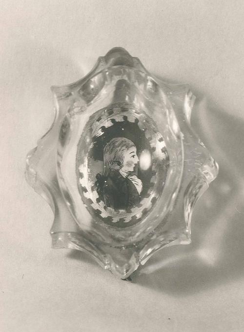 DescriptionConcave scalloped sides and head of a boy painted in colors. Ruby glass beneath. Cut glass.