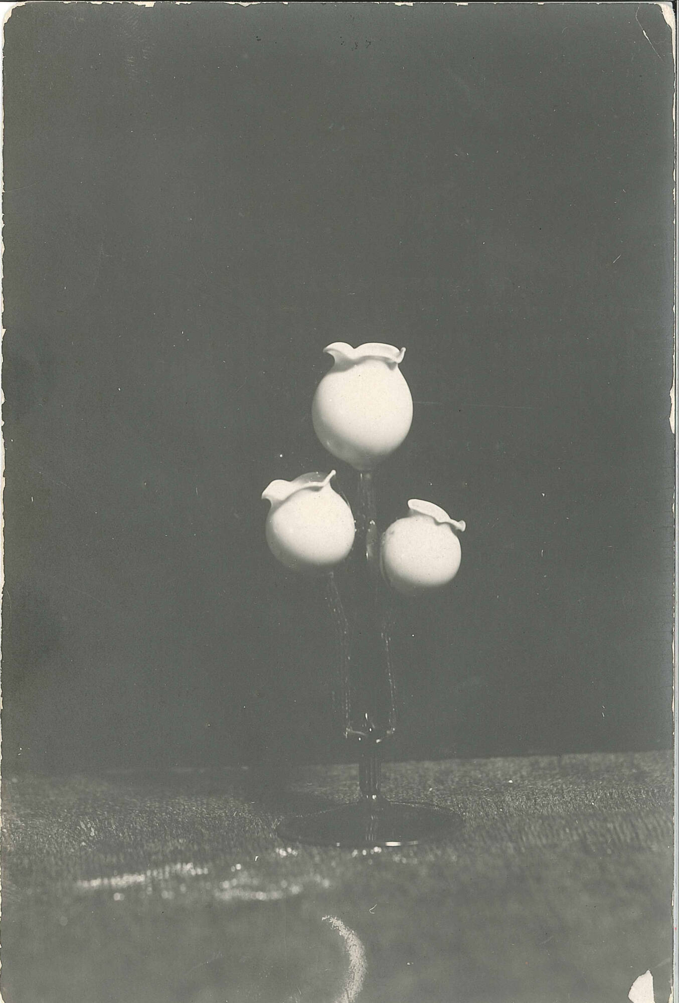 DescriptionOrnamental vase of transparent olive green glass forming base, stem and leaves, and three flowers of translucent, almost opaque buff colored glass.