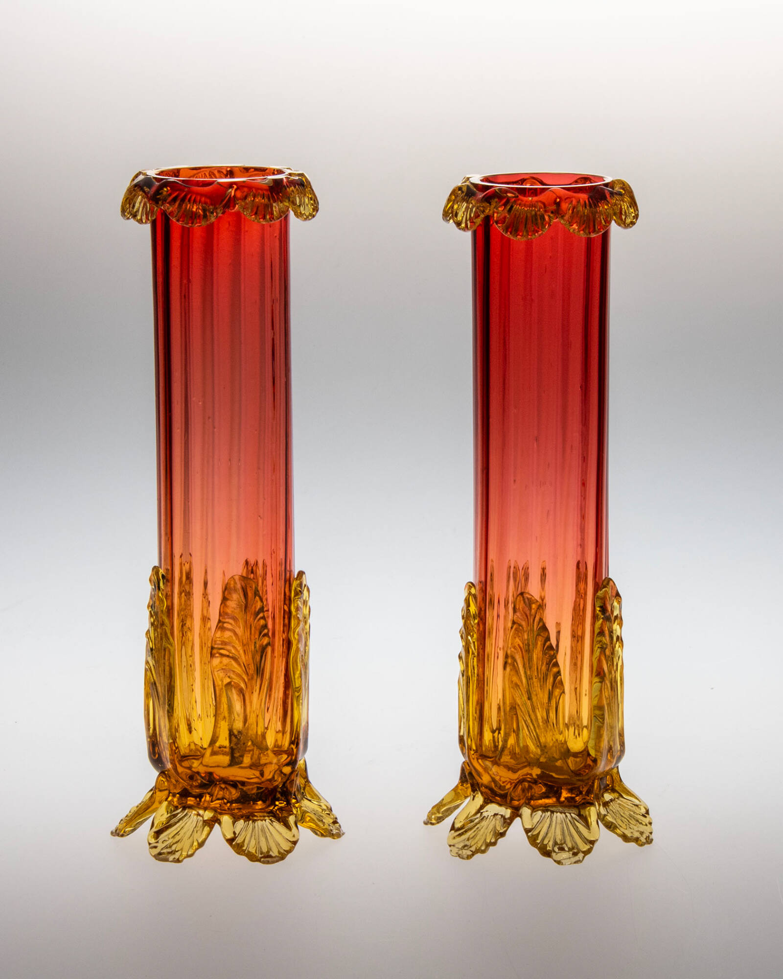 MediumAmberina-type non-lead glass; body blown and optic-molded with sixteen vertical ribs.