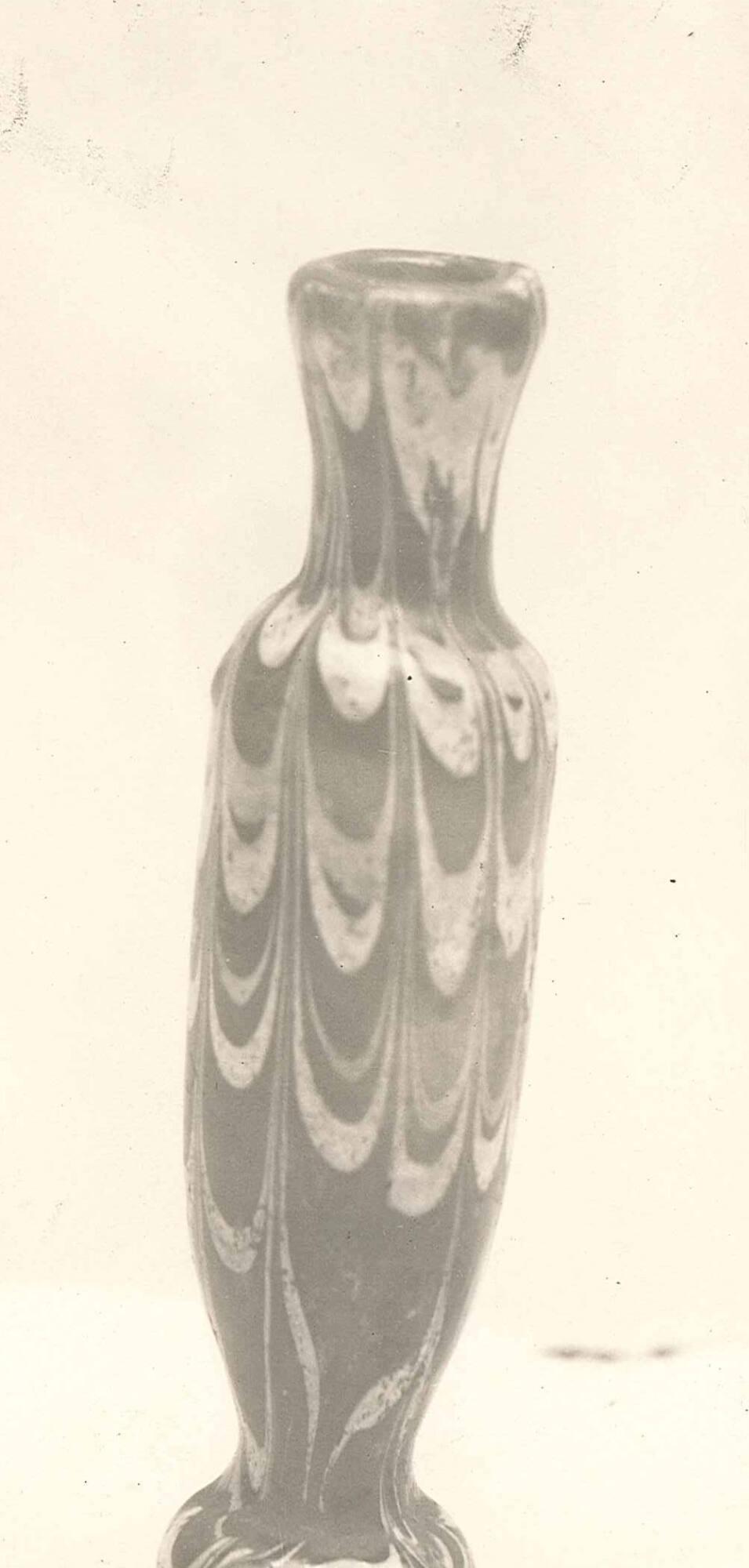 DescriptionDark green ground; opaque red, opaque white and opaque light green applied decoration; neck narrows toward shoulder; elongated, inverted ovoid body; body widens to form circular foot.