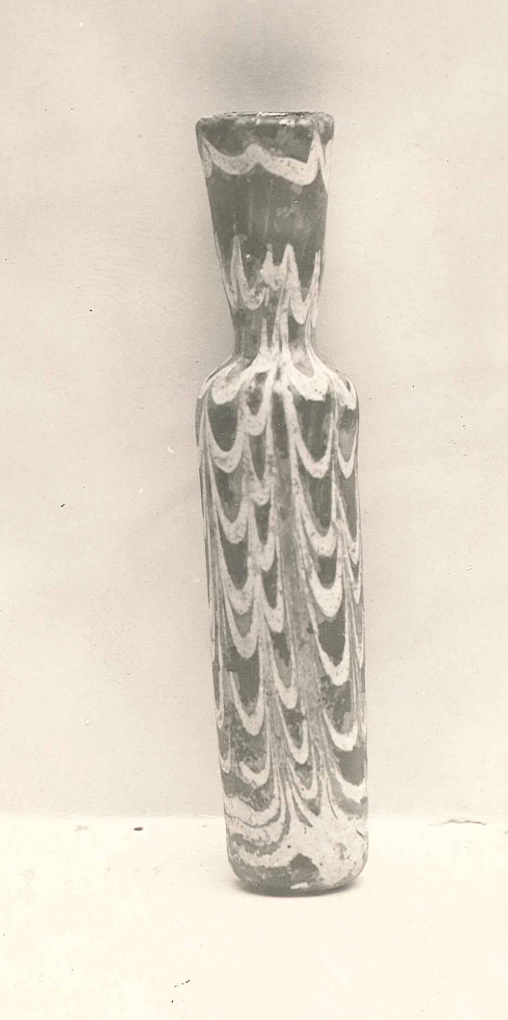 MediumGlass; mold-blown and tooled, white threads dragged and marvered.