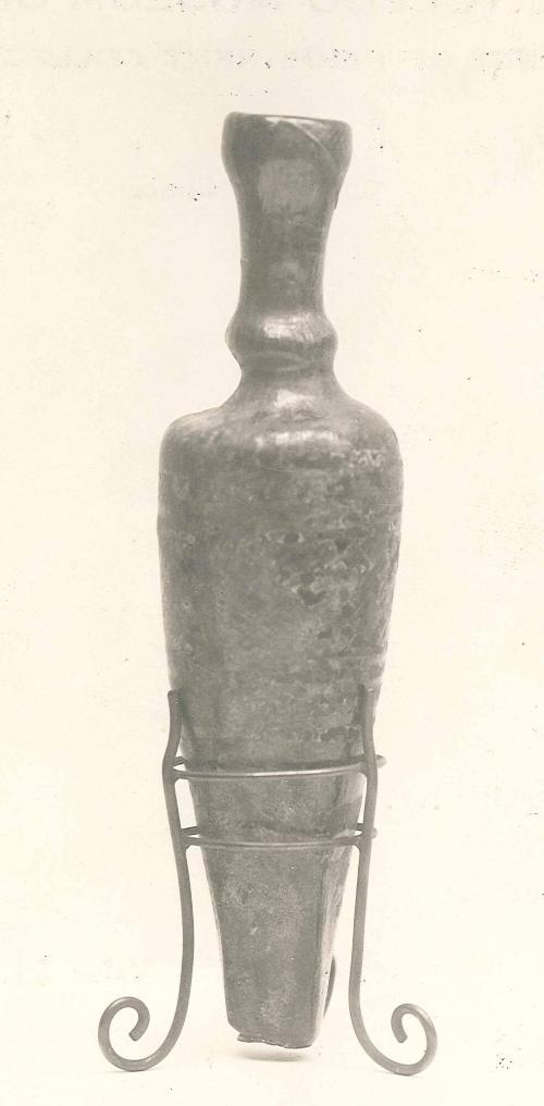MediumGlass; mold-blown and tooled, white threads dragged and marvered.