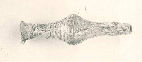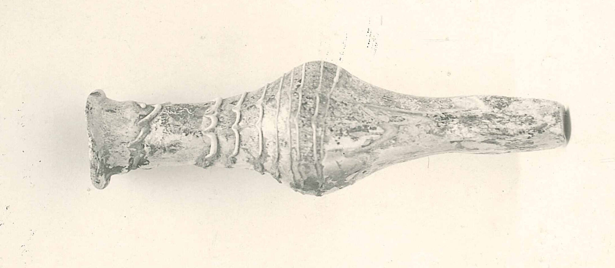 DescriptionDark yellow (appears dark blue); conical neck; round shoulder; cylindrical body; round bottom.