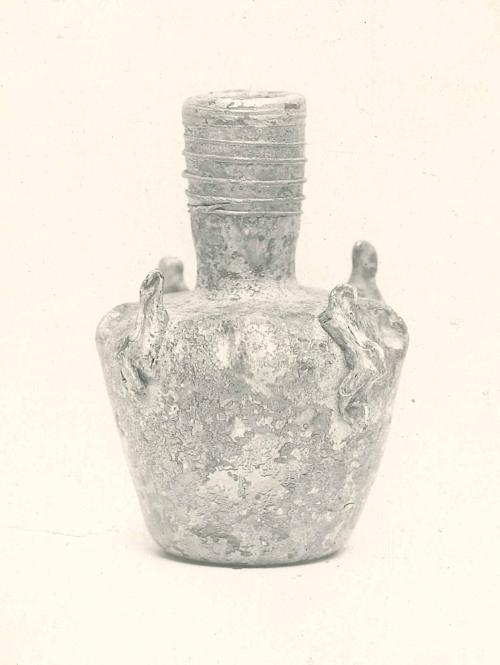 DescriptionColorless body; applied blue decoration; thick blue thread applied at rim; neck tapers slightly toward juncture with body; upper half of neck with thin blue spiral thread; horizontal shoulder; four applied blue forms, possibly birds, on edge of shoulder; between birds, four small pinched ribs; body narrows towards base.