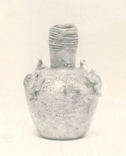 DescriptionDark blue body; applied light green decoration; light green spiral thread applied to rim and upper half of neck; neck narrows slightly toward juncture with body; horizontal shoulder; four applied light green forms, possibly birds, applied to edge of shoulder; between birds, four small pinched ribs; body narrows toward base.
