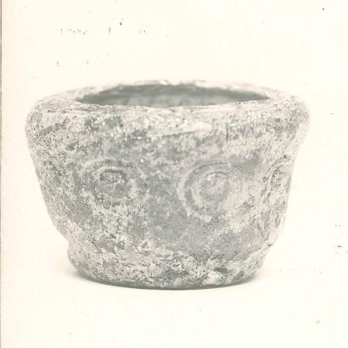 DescriptionStreaky light purple; rim curves inward; body narrows toward base; decorated with nine medallions: two intaglio concentric rings, raised dot in center; bottom tooled slightly to form base.