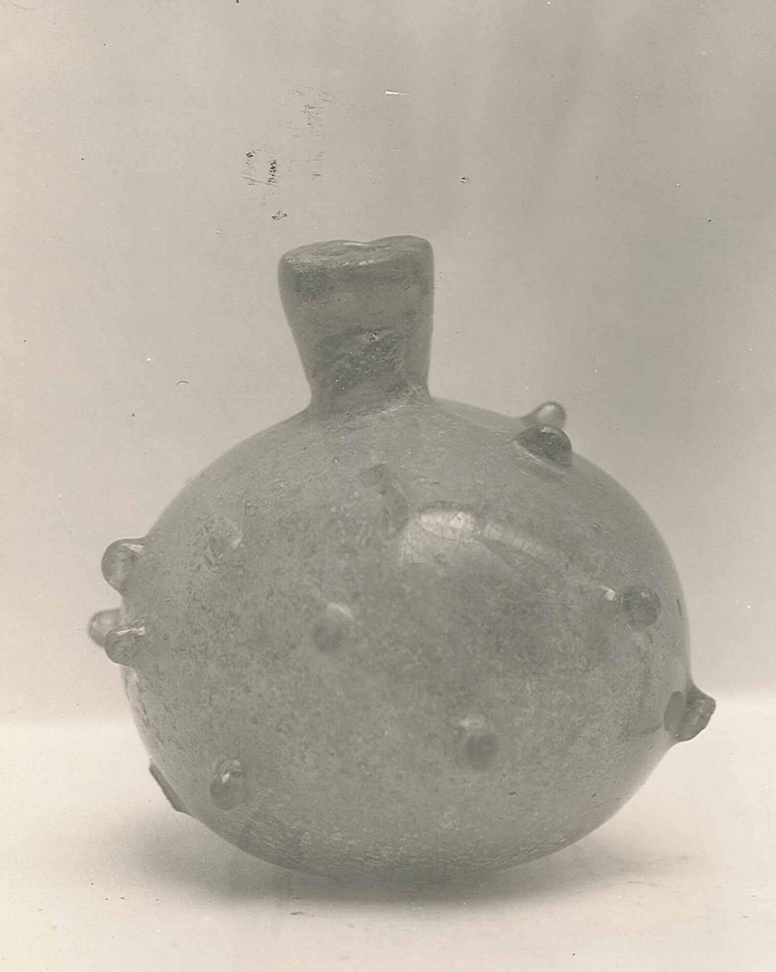 DescriptionColorless with yellow-green tinge; small conical neck; spherical body; body with small spikes, tooled out while glass was hot.