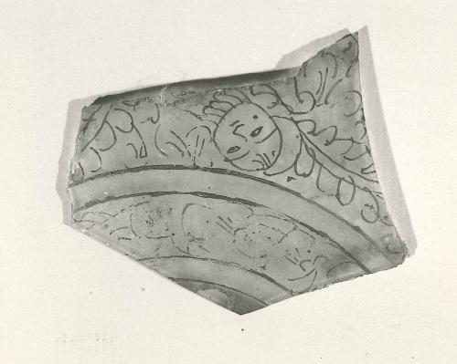 MediumGlass; free blown; enameled. Colorless ground; red and blue enamel