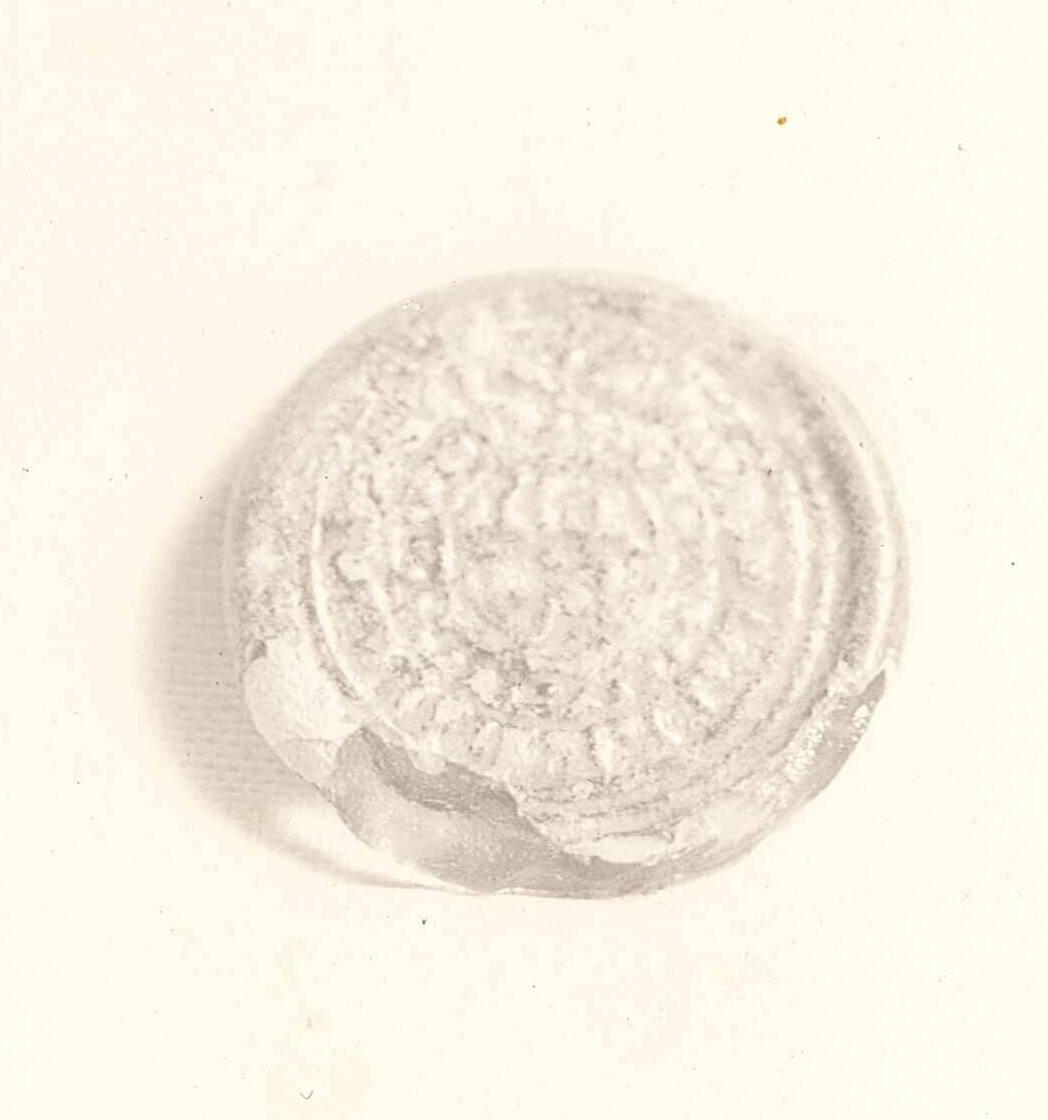DescriptionTransparent clear glass with heavy incrustation. Cufic inscription impressed in the center.