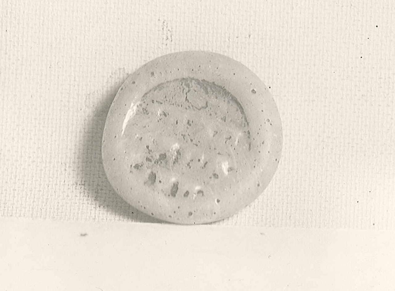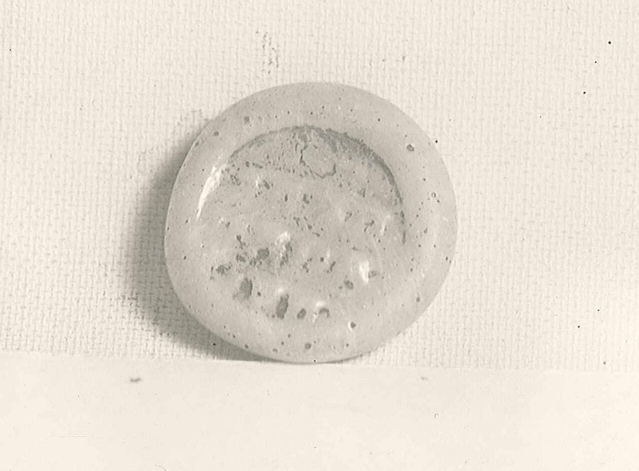 DescriptionSemi-opaque white glass with Cufic inscription impressed in the center.