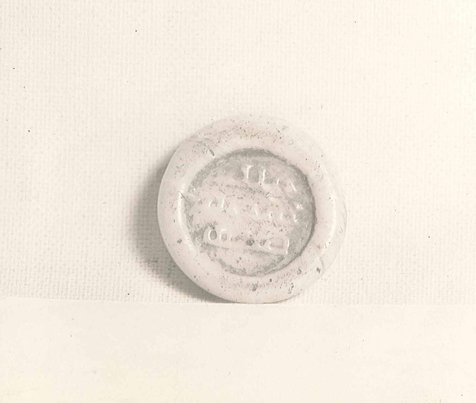DescriptionOpaque white glass with Cufic inscription impressed in the center.