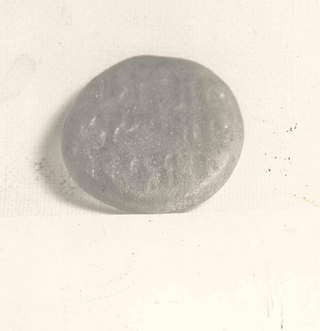 DescriptionTranslucent light green glass with impressed inscription on both face and reverse.