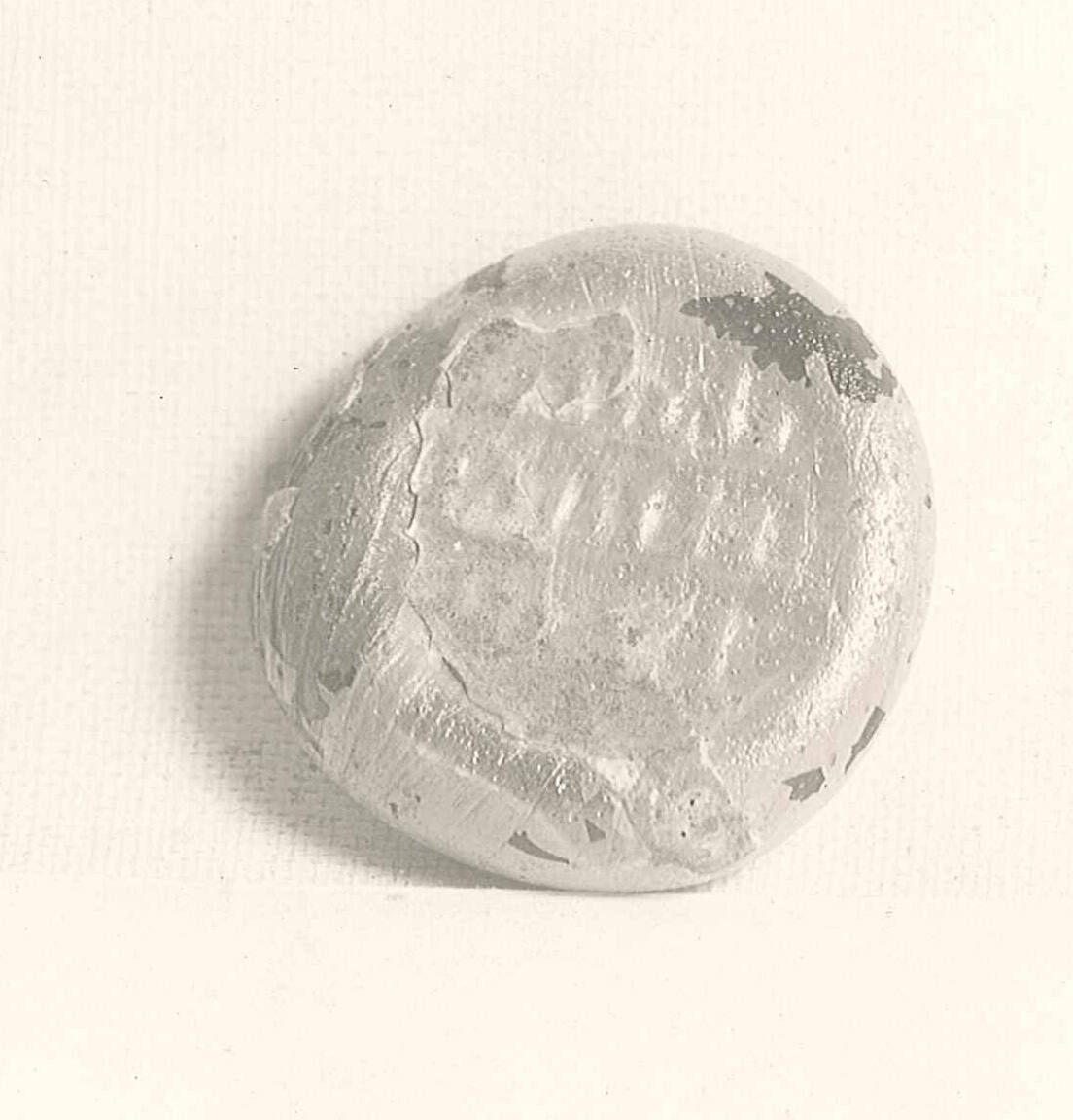 DescriptionTranslucent dark blue glass with Cufic inscription impressed in center. Covered with brilliant iridescence.