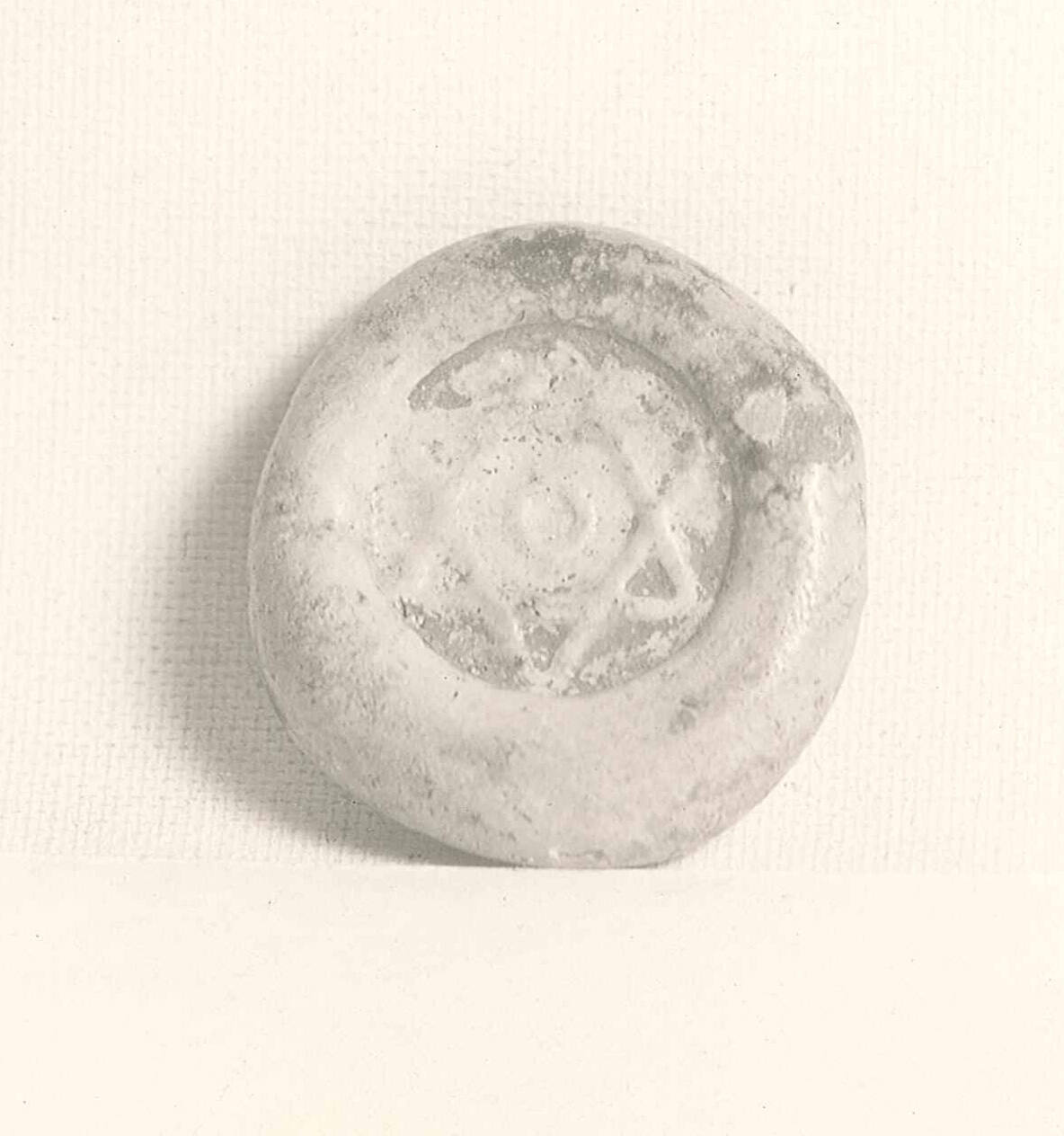 DescriptionBlack opaque glass coated with light blue opaque glass. Six-pointed star impressed in the center.