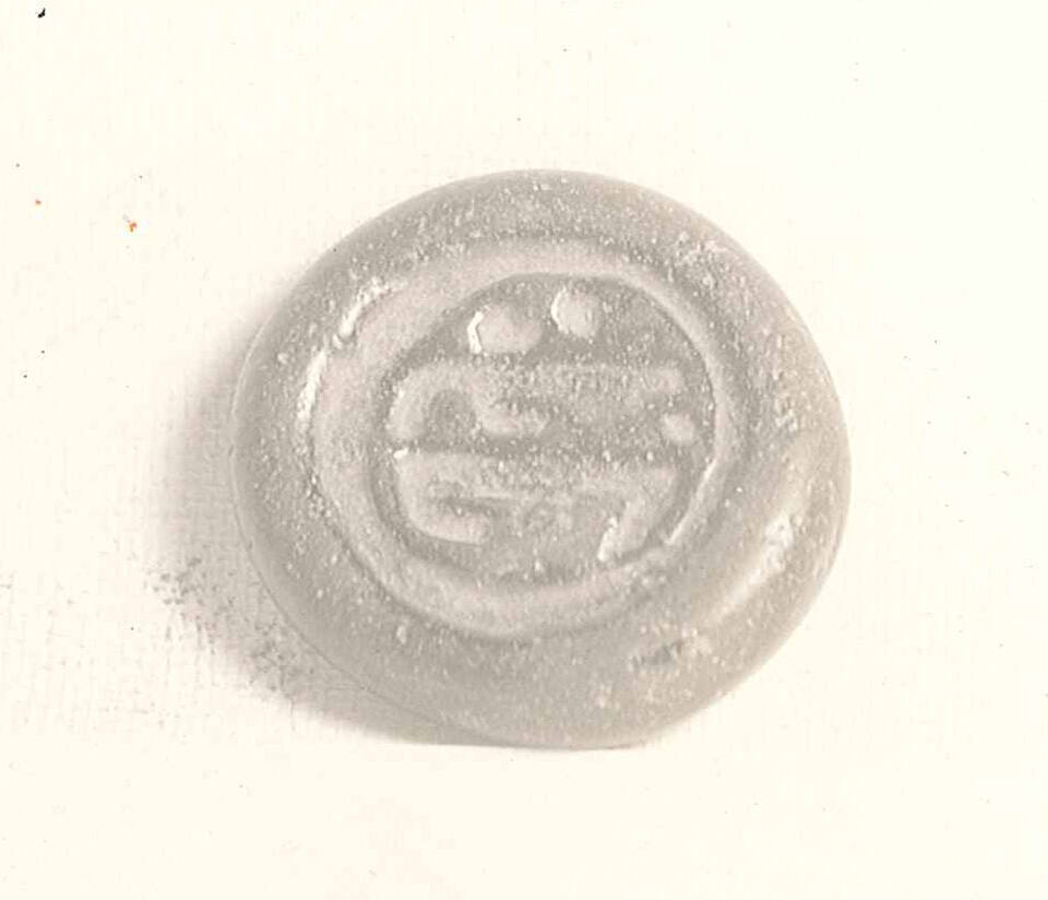 DescriptionOpaque black glass with Cufic inscription very plainly impressed in the center.
