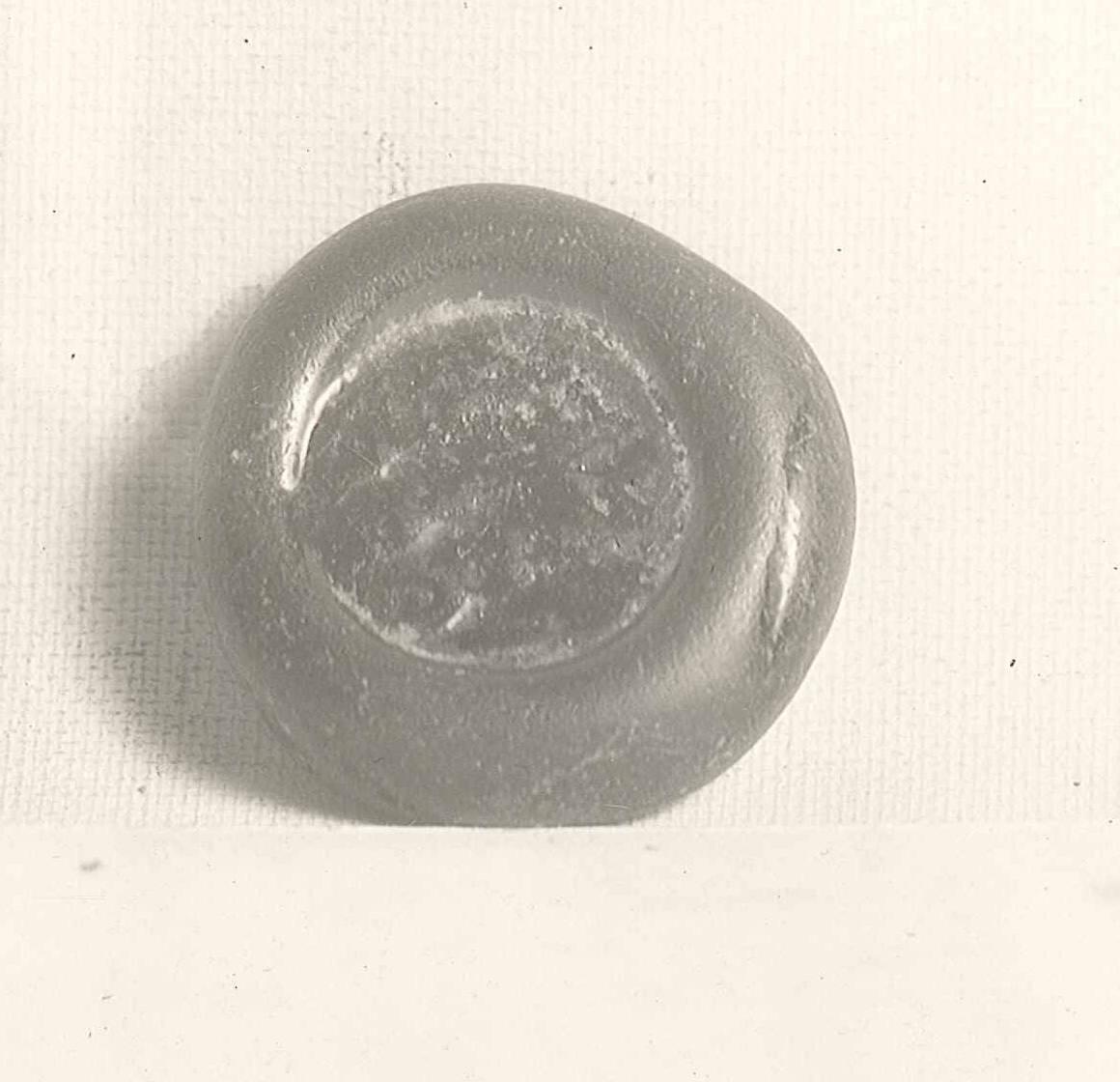 DescriptionOpaque black glass with Cufic inscription impressed in the center.