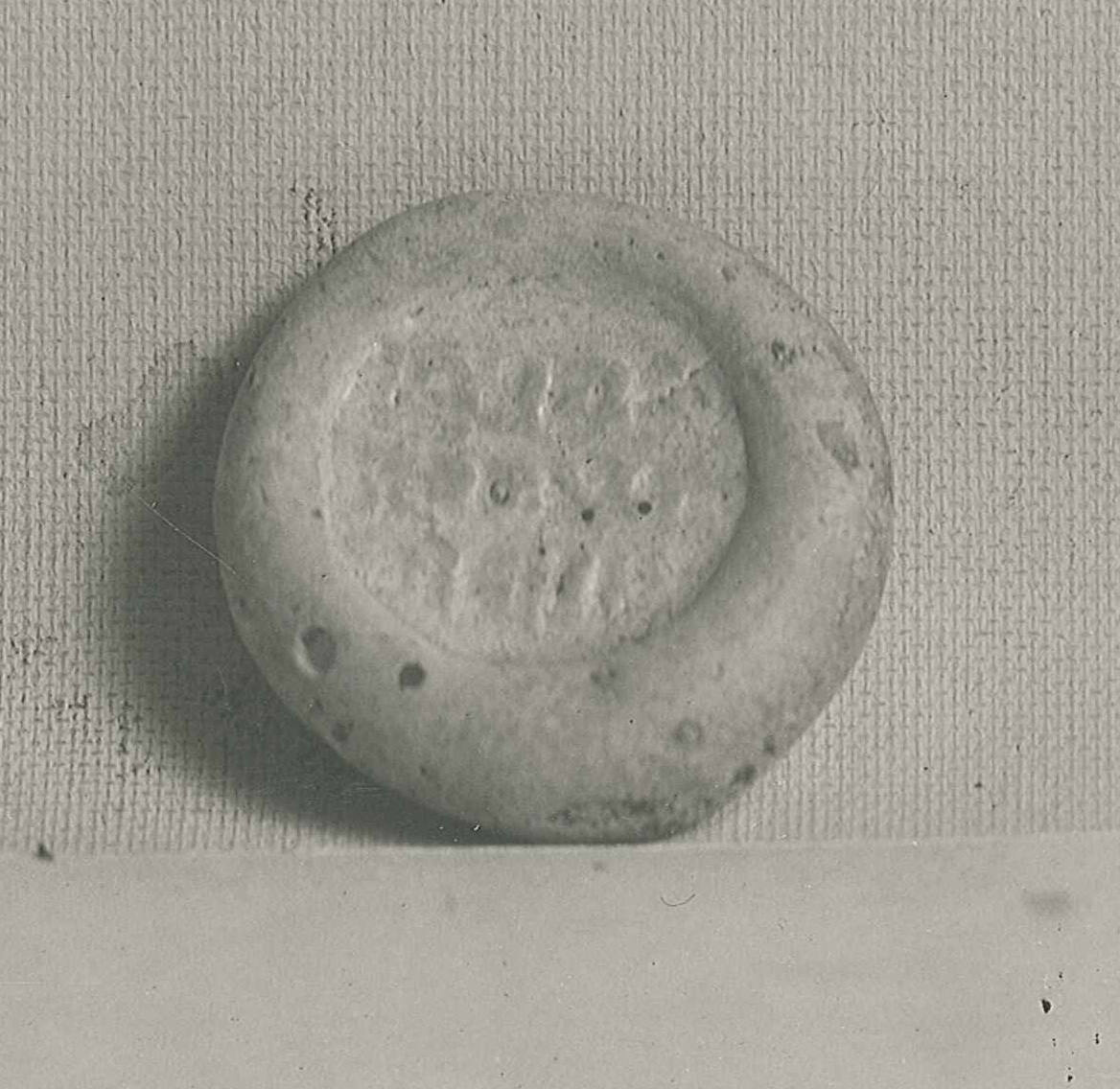 DescriptionOpaque white glass with Cufic inscription impressed in the center.