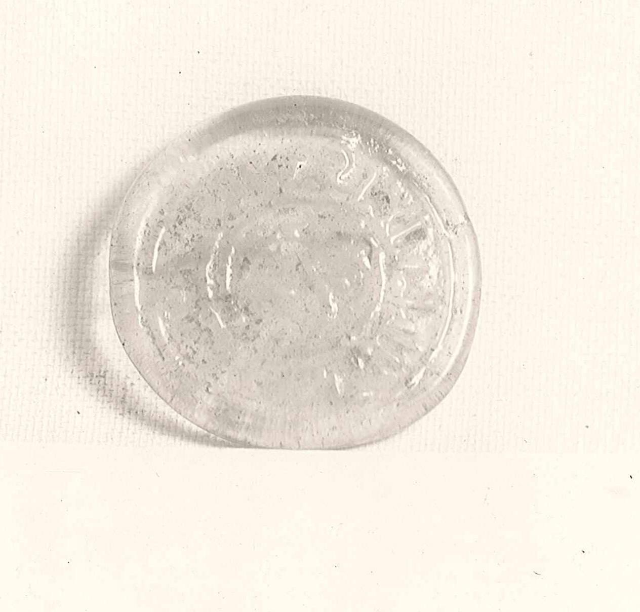 DescriptionFlat circular piece of translucent light green glass with impressed inscription on face.