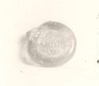 DescriptionTranslucent green glass with inscription impressed in the center.