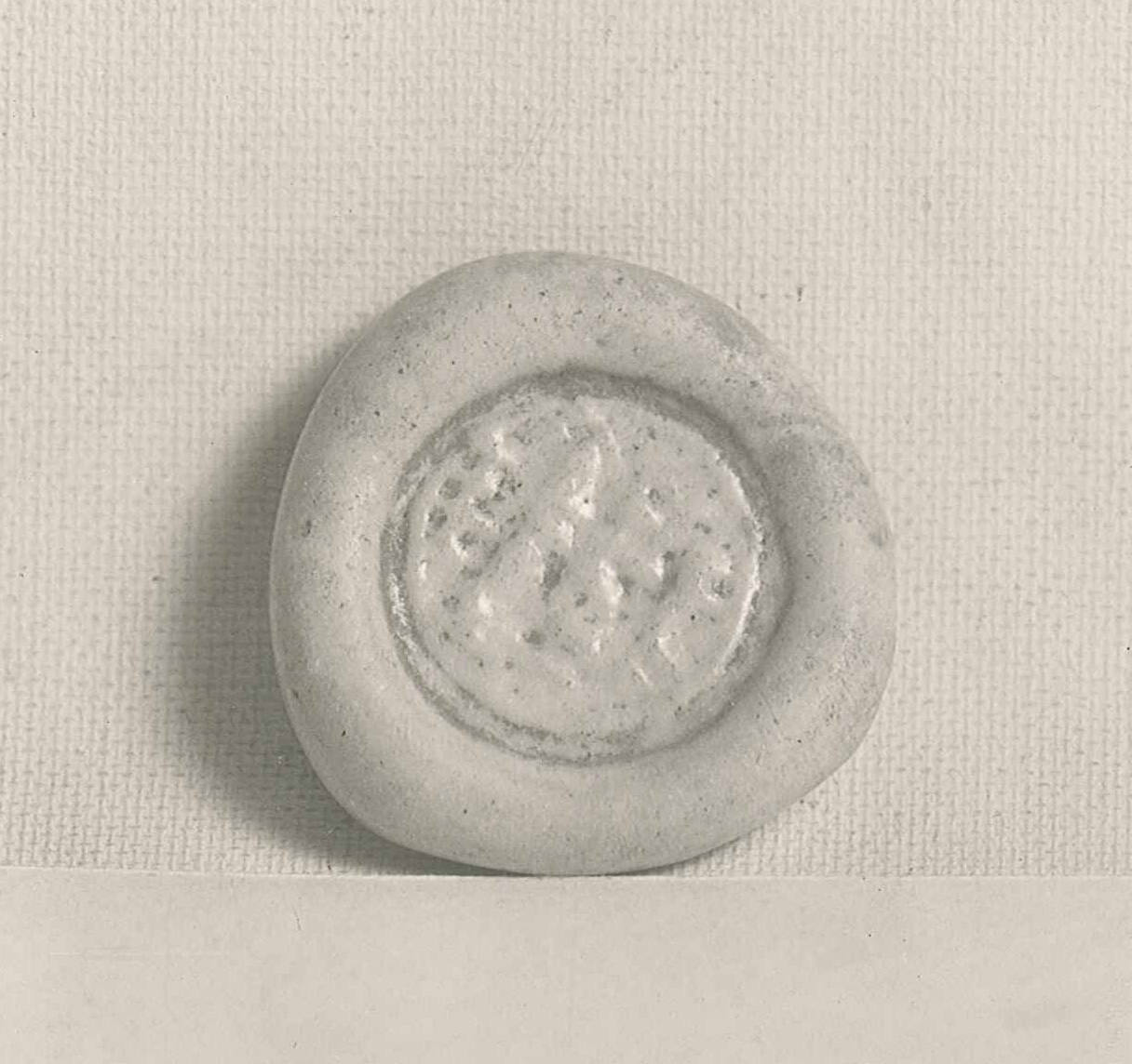 DescriptionOpaque, very light green glass with Cufic inscription impressed in the center.