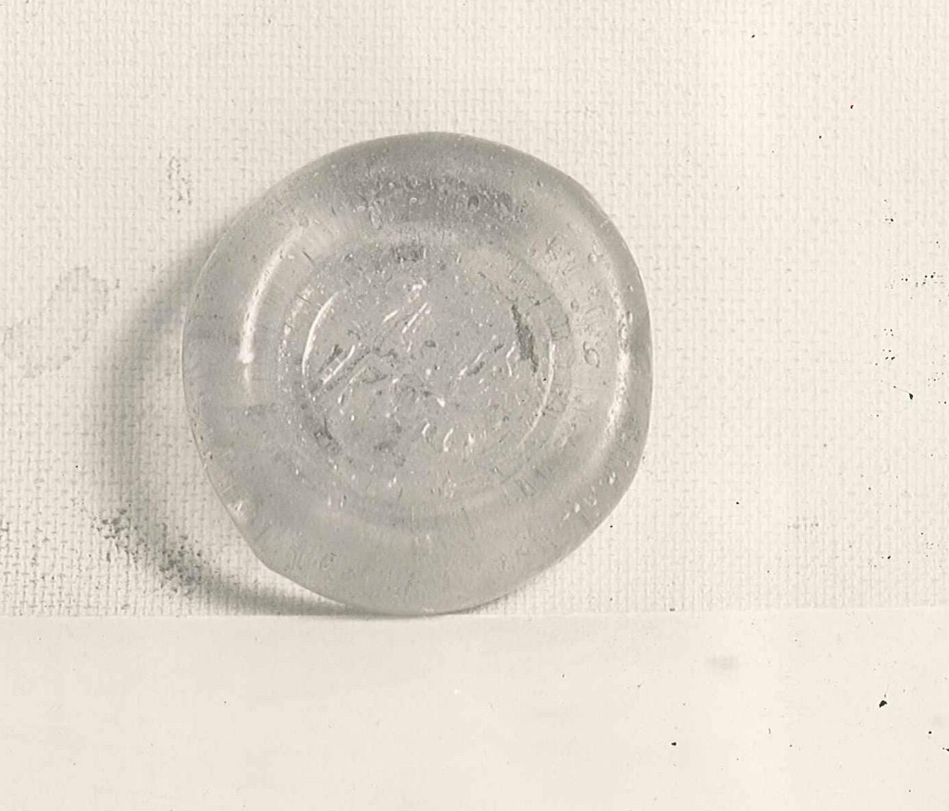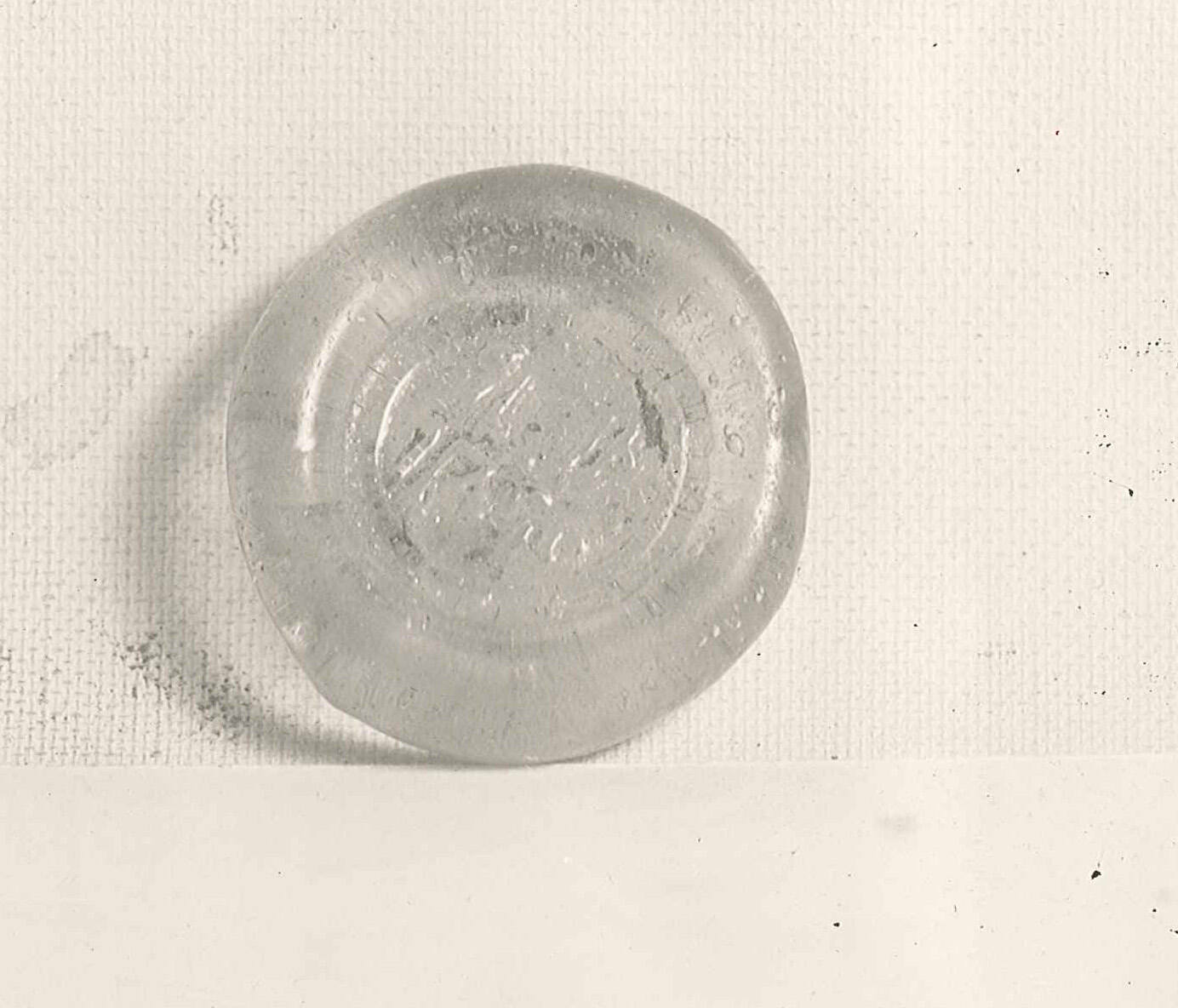DescriptionClear glass with Cufic inscription impressed in the center.