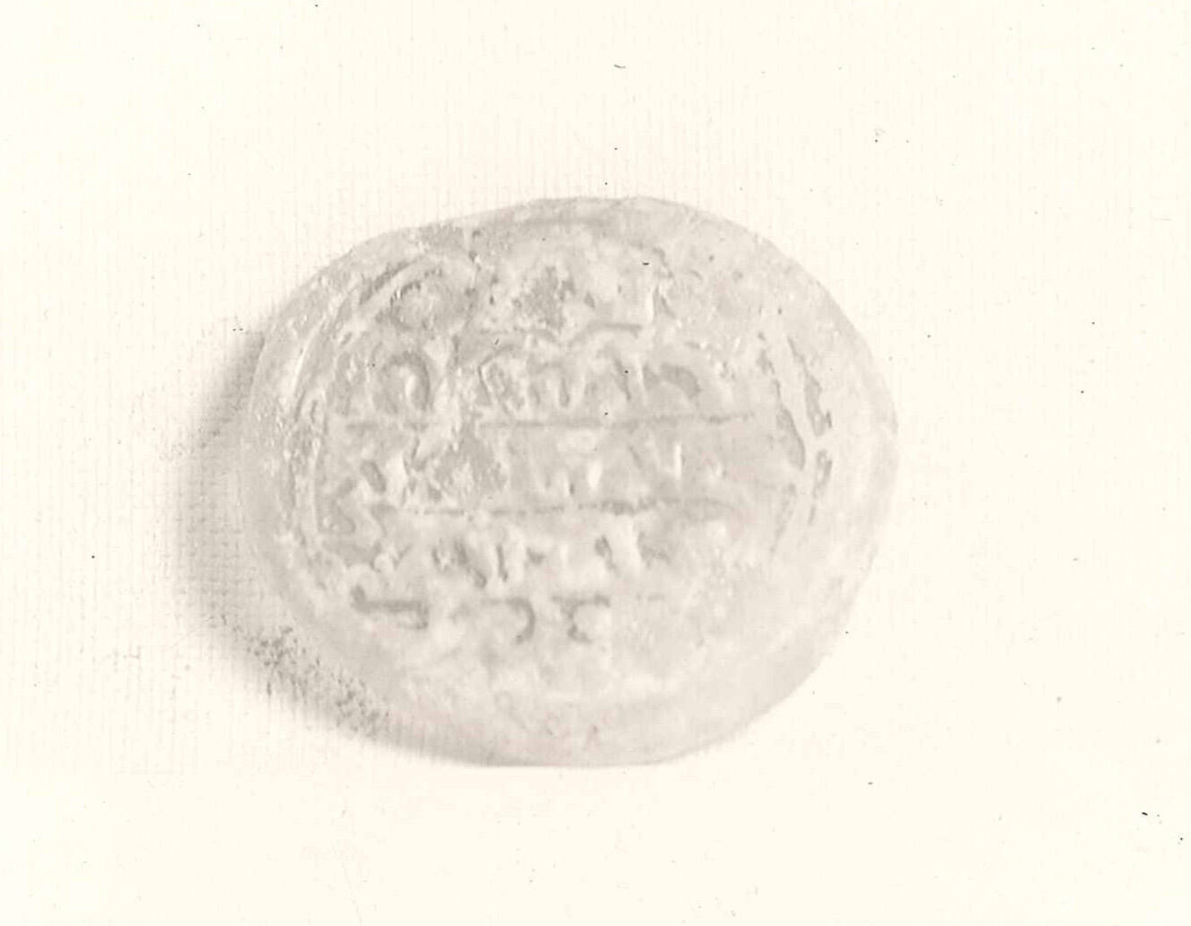 DescriptionLight green translucent glass with Cufic inscription impressed in the center. Rather oval shape.