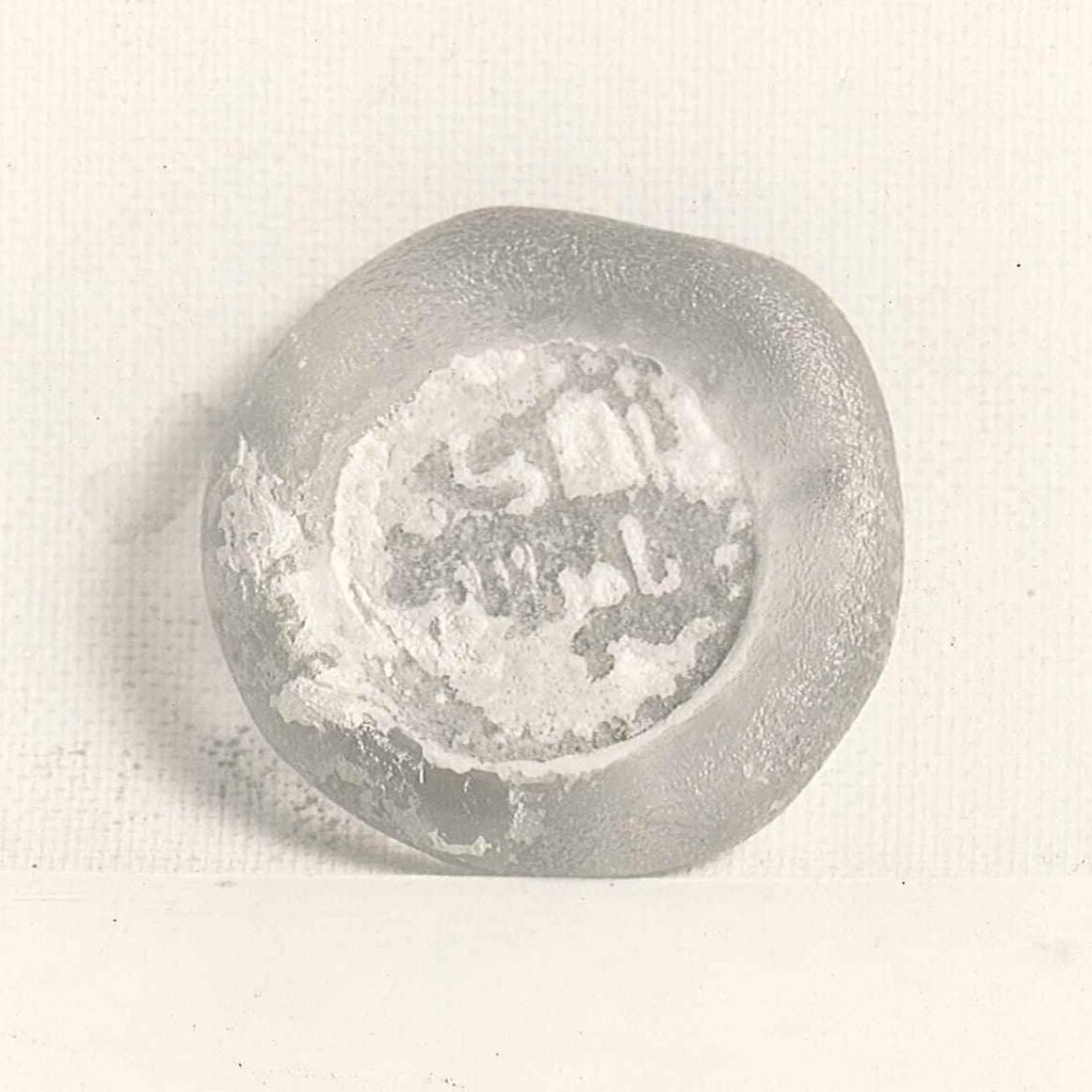 DescriptionTranslucent green glass with Cufic inscription impressed on both face and reverse. Some incrustation.