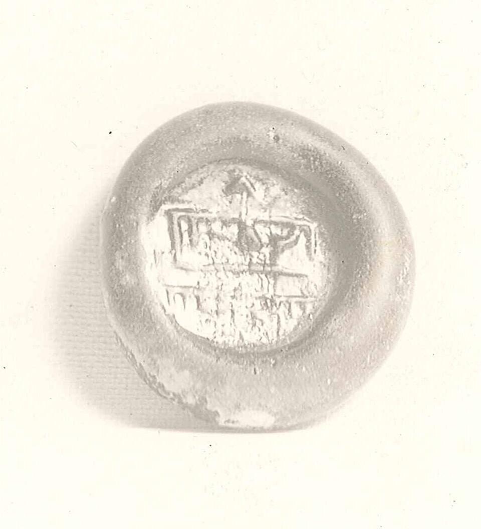 DescriptionTranslucent dark brown glass with Cufic inscription impressed on the face.
