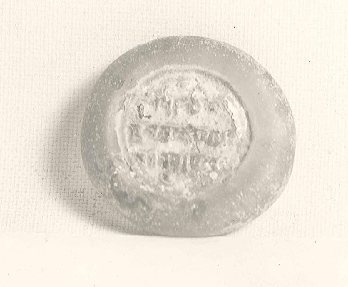 DescriptionTranslucent light green glass with Cufic inscription impressed. Some iridescence.