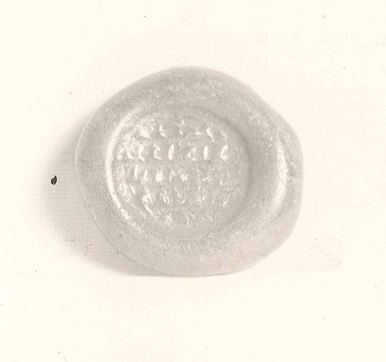 DescriptionSemi-translucent blue glass with Cufic inscription impressed in the center.