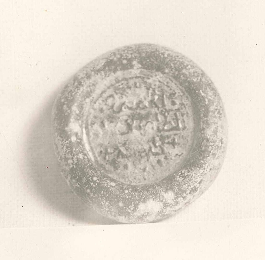 DescriptionLight olive-green glass with inscriptions impressed on both face and reverse.