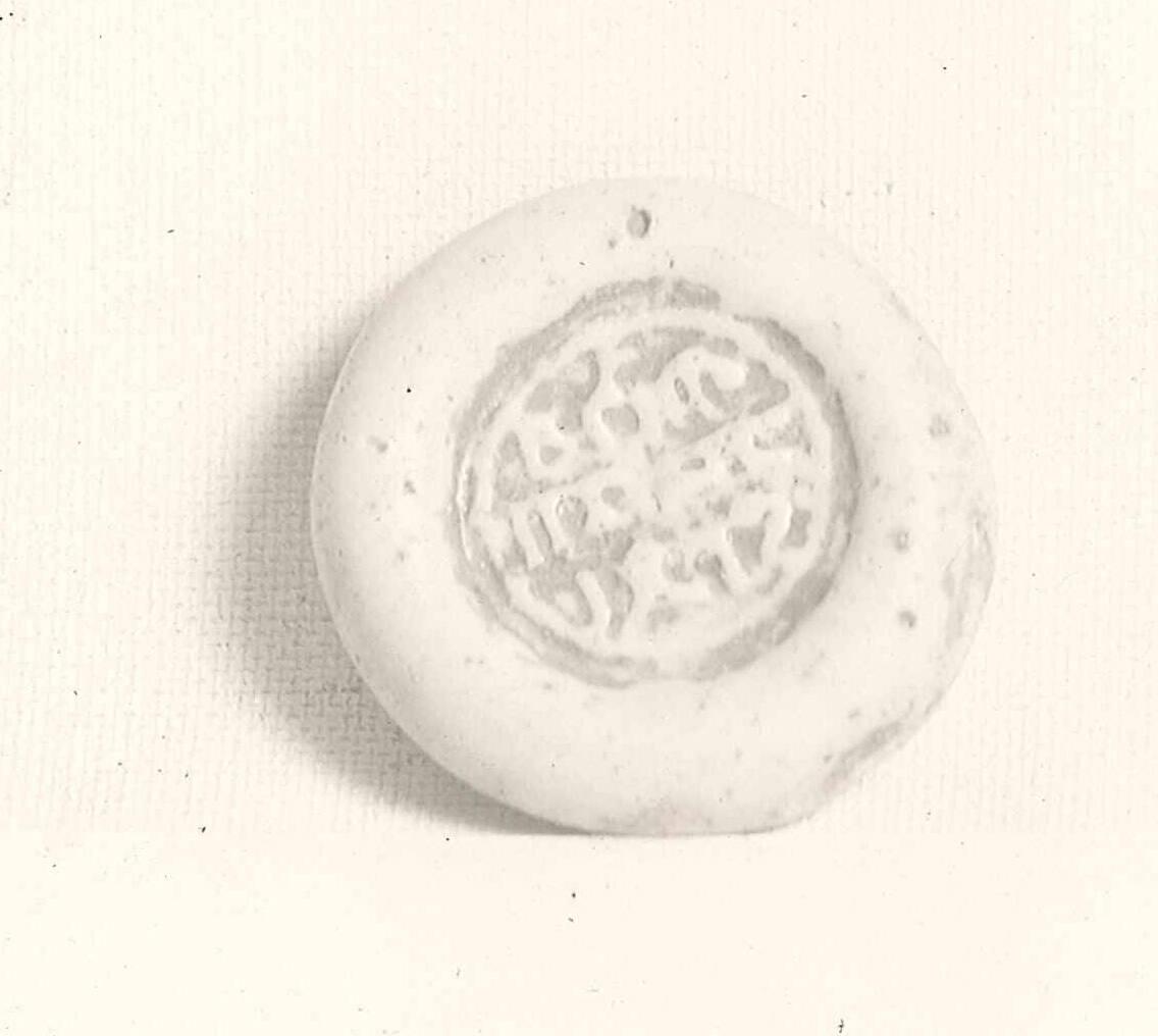 DescriptionSmall coin of opaque bluish-white glass with Cufic inscription impressed in the center.