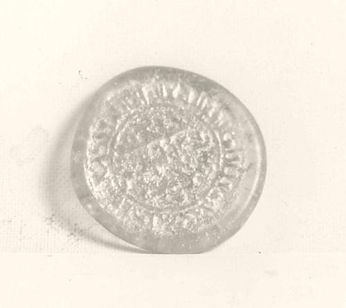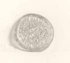 DescriptionFlat coin of translucent green glass with silvery iridescence. Impressed inscription on both face and reverse.
