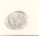 DescriptionTranslucent light amber glass with inscription impressed in the center. Some iridescence.