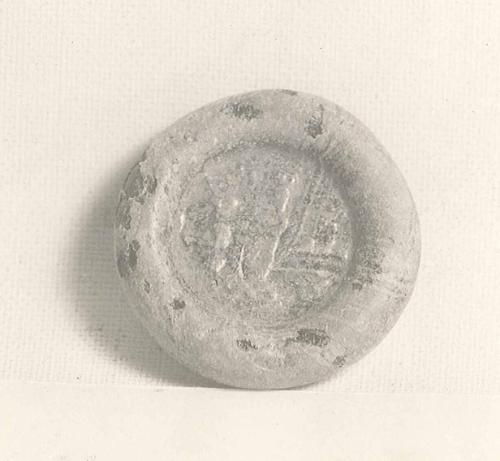 DescriptionOpaque black glass coated with light blue opaque glass. Cufic inscription impressed in the center.