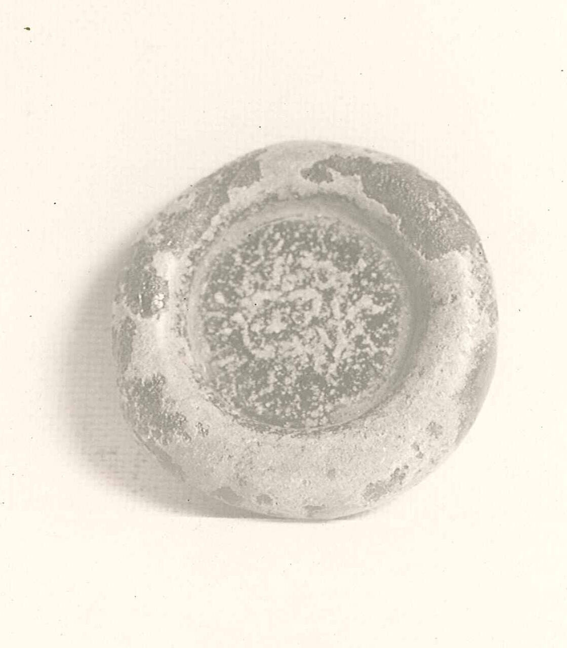 DescriptionTranslucent amber glass with inscription impressed in the center. Some incrustation.