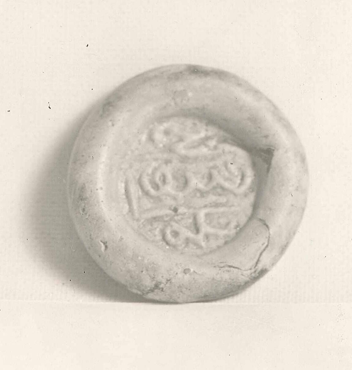 DescriptionOpaque black glass coated with light blue opaque glass. Cufic inscription impressed in the center.