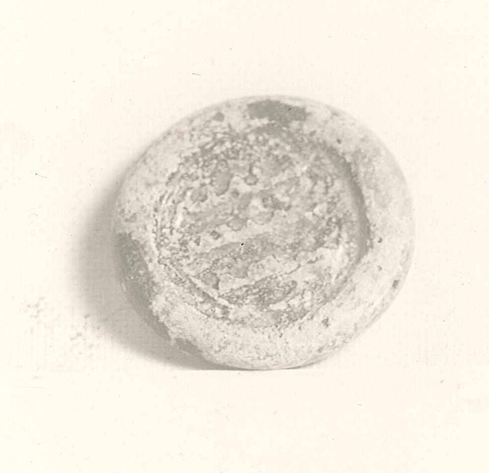 DescriptionTranslucent manganese glass with inscription impressed in the center. Iridescence.