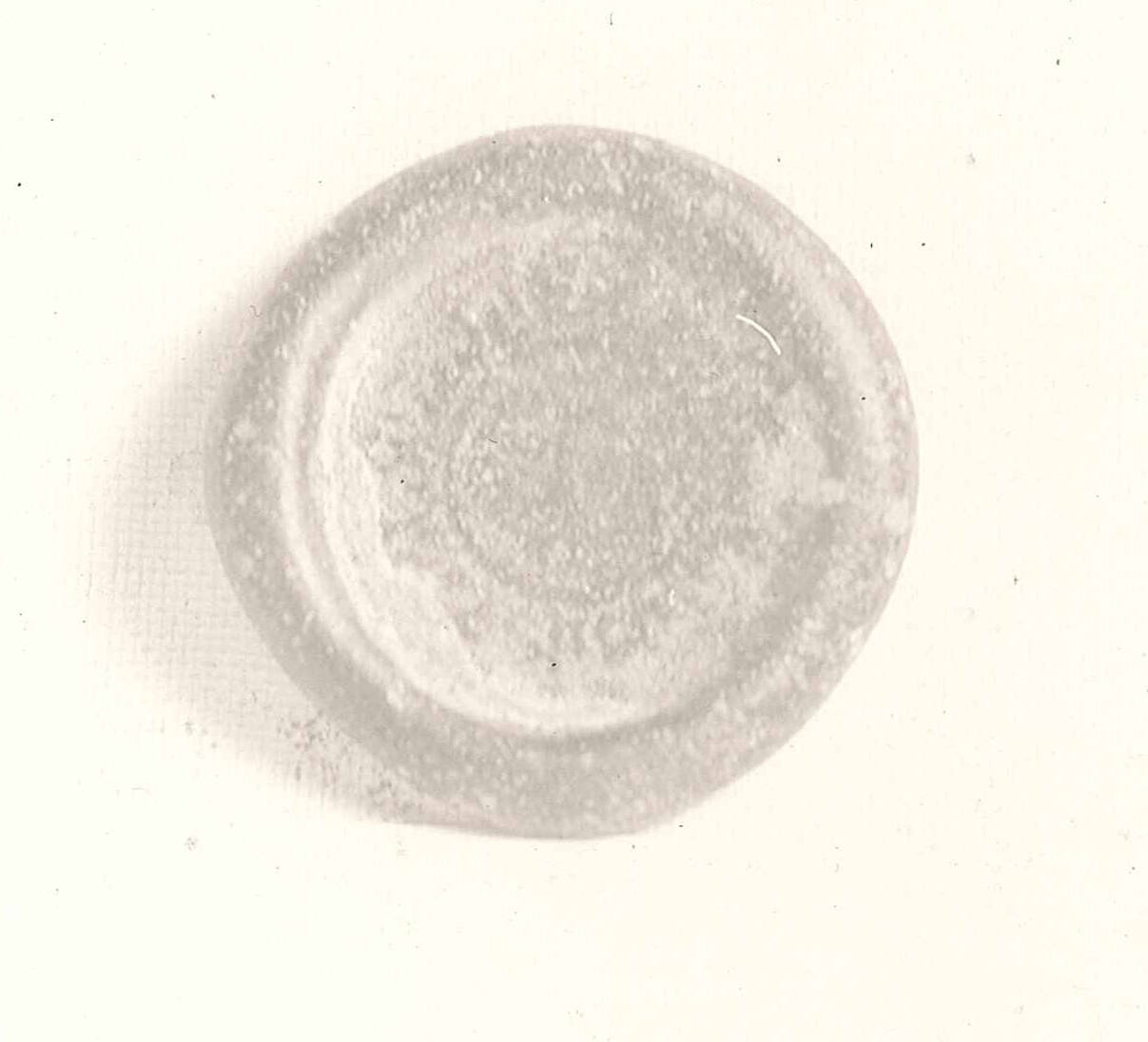 DescriptionTranslucent olive-green glass with some iridescence. Inscription impressed on face and faintly on back.