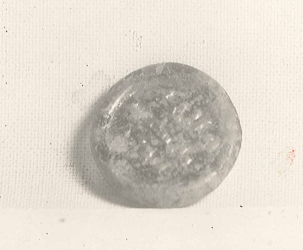DescriptionTranslucent manganese glass partly covered with spots of opaque glass. Cufic inscription impressed in the center.
