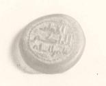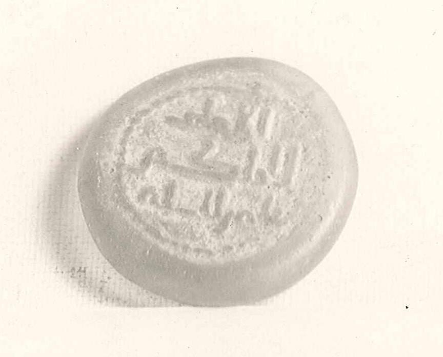 DescriptionTranslucent clear glass with Cufic inscription impressed in the center.