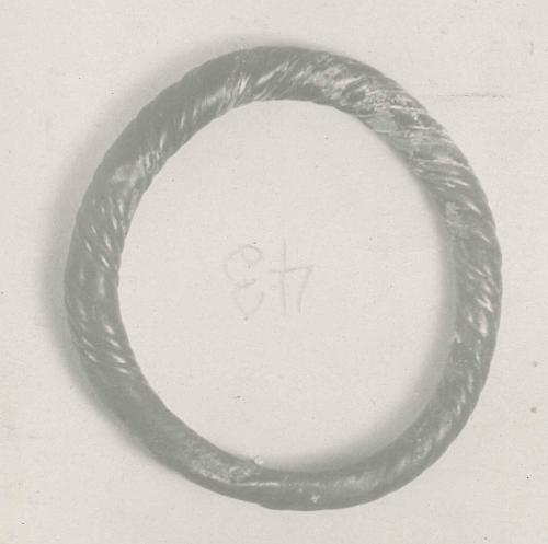 DescriptionCylindrical glass stick, twisted like a rope and shaped into a circle. Translucent, dark manganese purple glass.